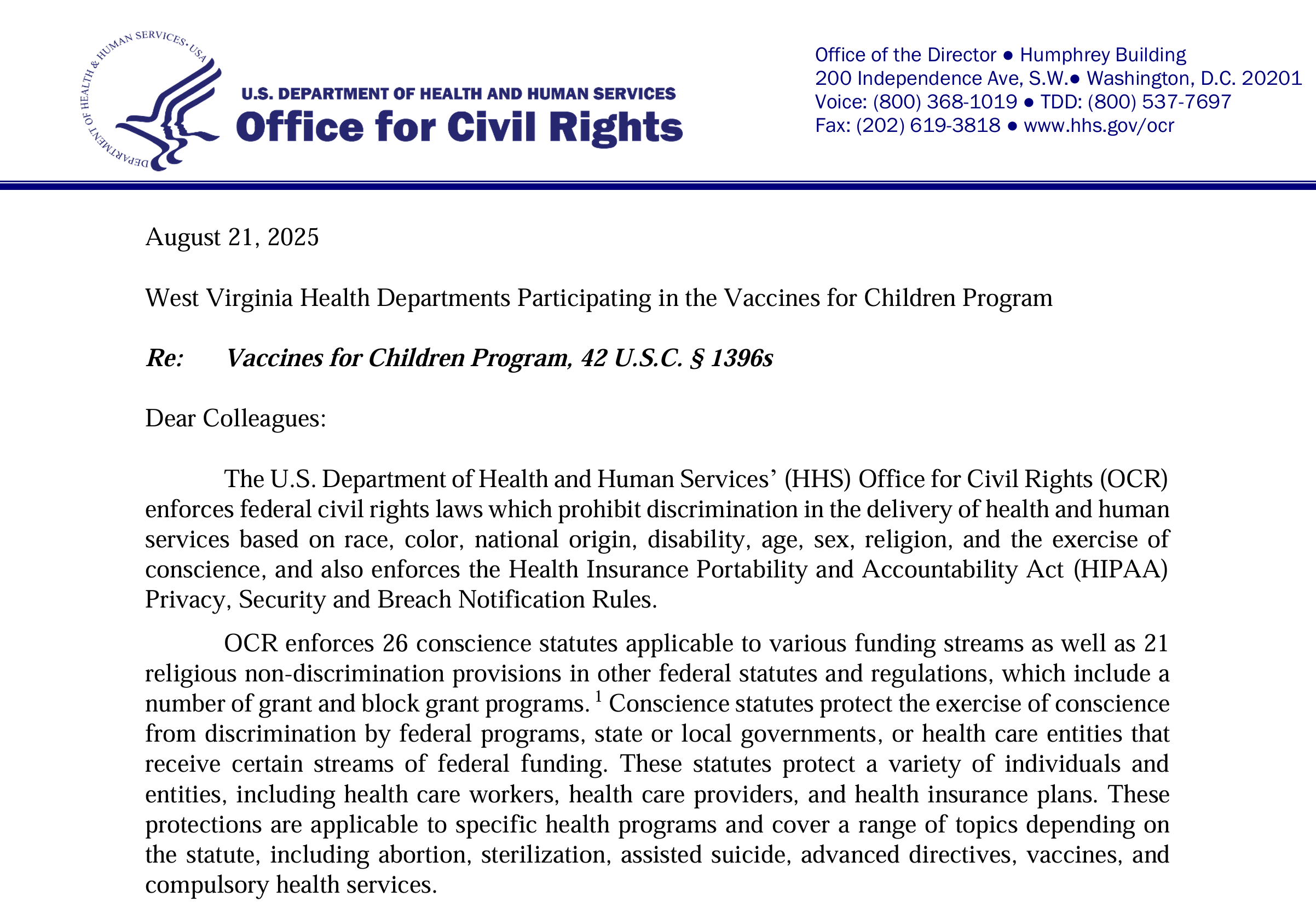 OCR, responsible for enforcing 26 conscience statutes and 21 religious nondiscrimination provisions, uses this letter to remind West Virginia, a VCP participant receiving $1.37 billion annually in federal Medicaid funds, of its duty to comply. The directive highlights that failure to recognize religious exemptions under EPRA could violate federal requirements, potentially jeopardizing funding and program integrity.