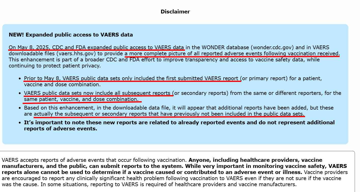 Before May 8, 2025, VAERS public data sets were limited to initial reports for a patient, vaccine, and dose combination. This left out valuable follow-up information that could provide context about reported adverse events. Now, under RFK Jr.’s guidance, the CDC and FDA have expanded access to include all subsequent reports, offering a more complete dataset in the WONDER database (wonder.cdc.gov) and VAERS downloadable files (vaers.hhs.gov).