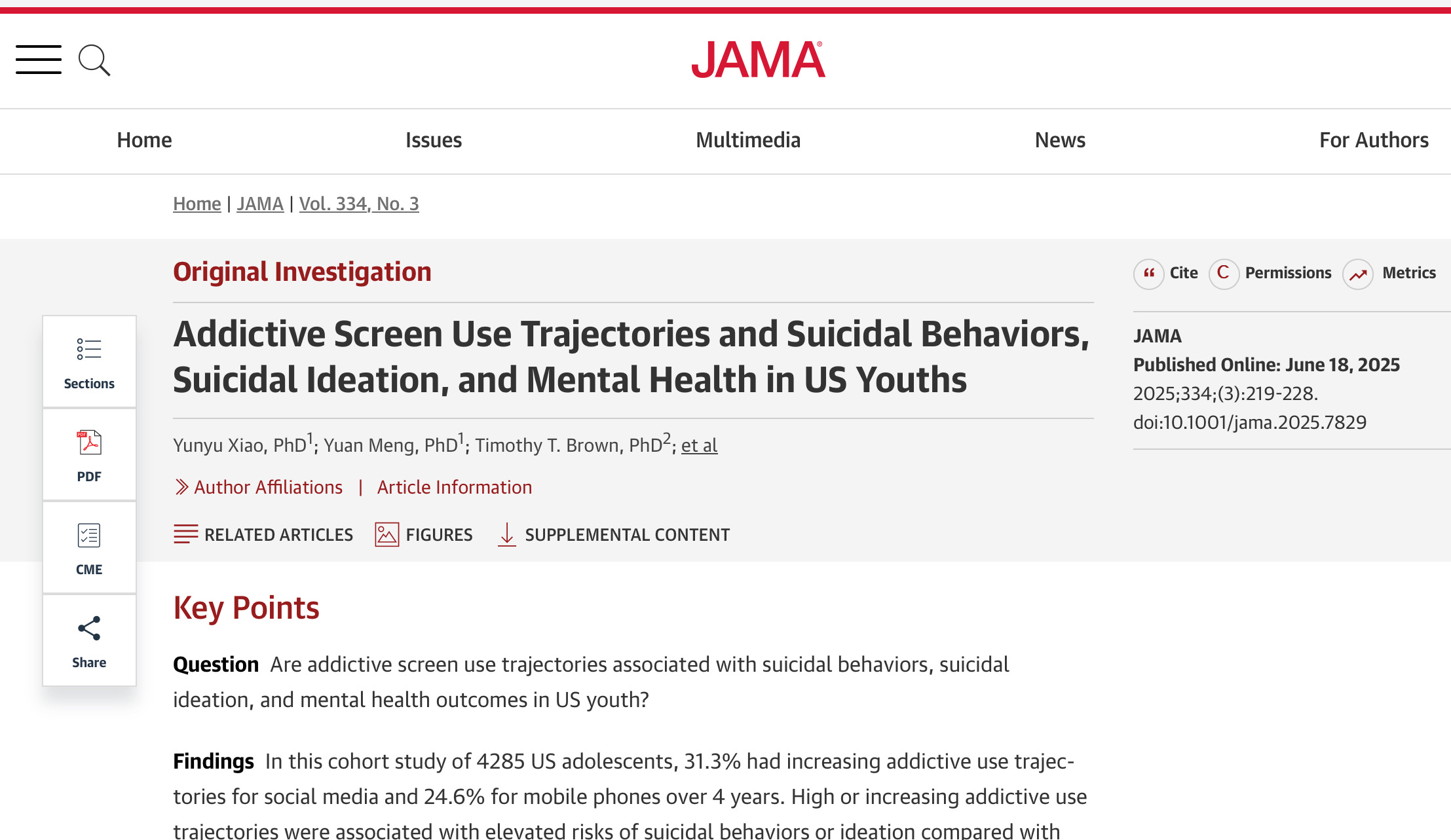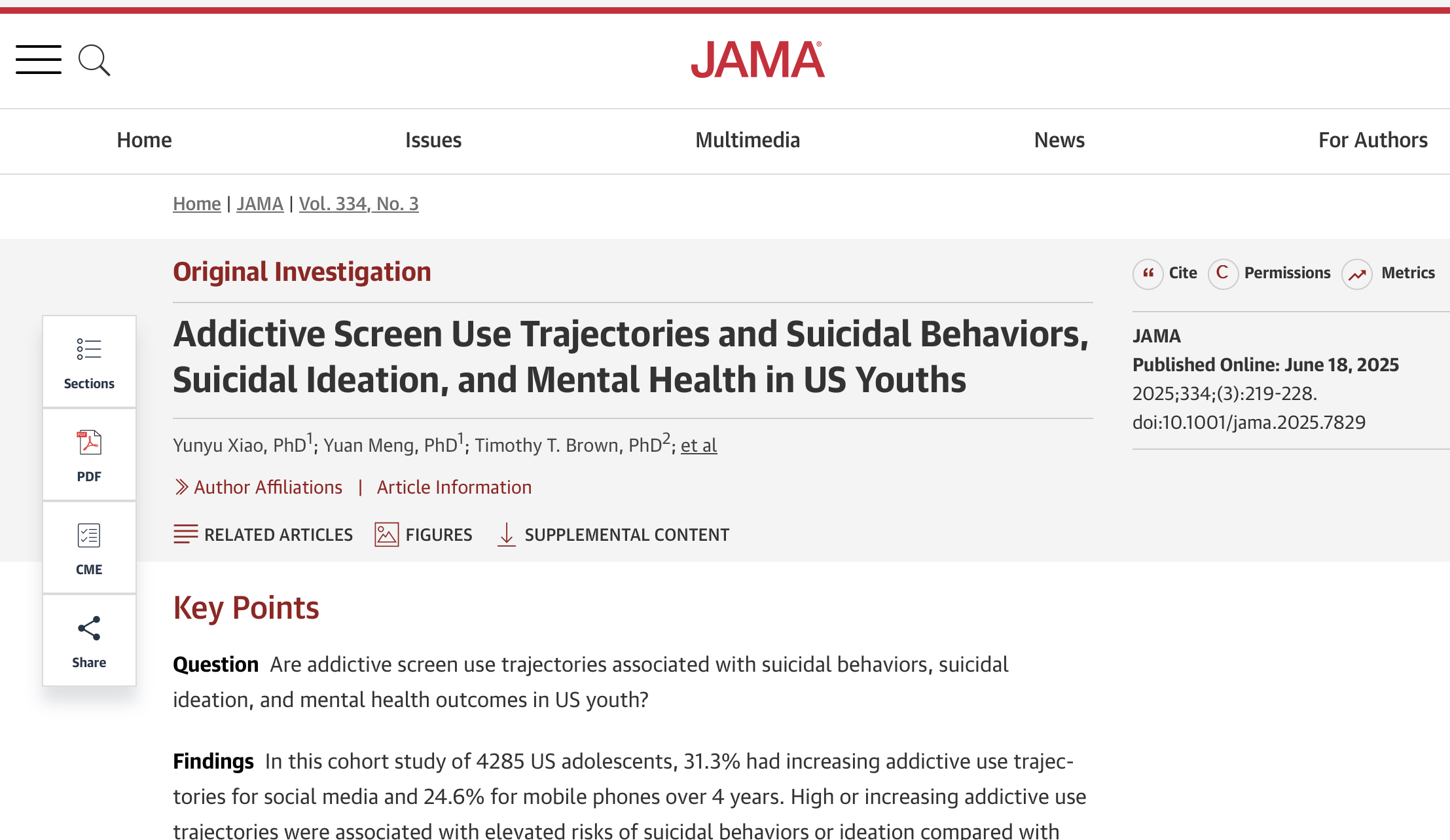 Xiao Y, Lin LY, Ganson KT, et al. Addictive Screen Use Trajectories and Mental Health Outcomes Among US Adolescents. JAMA. Published online June 18, 2025. doi:10.1001/jama.2025.7829