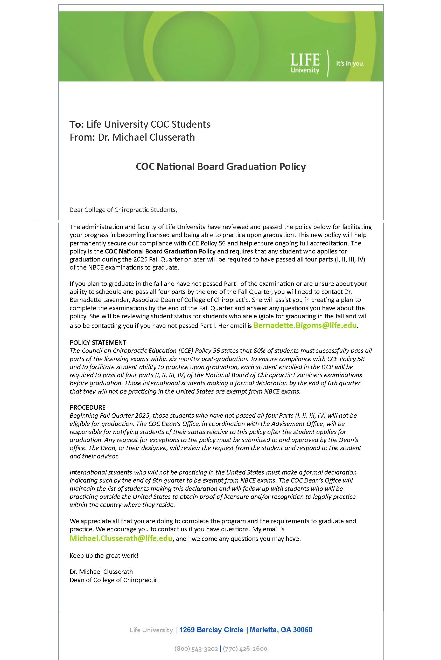 “This new policy will help permanently secure our compliance with CCE Policy 56…” — Life University announcement, February 2025