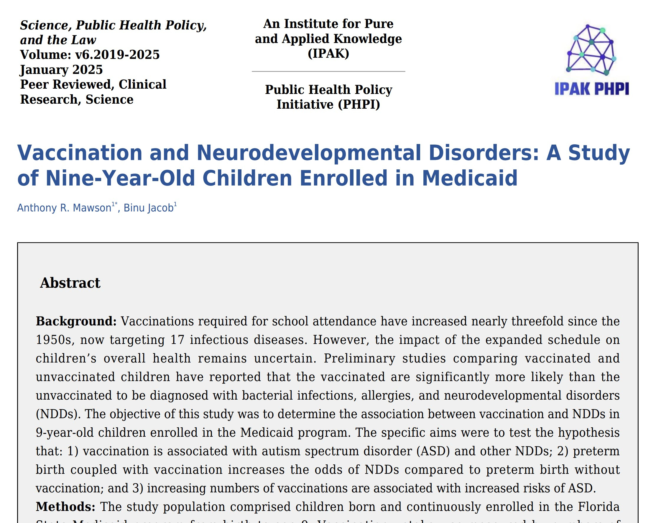 A groundbreaking study published today in Science, Public Health Policy, and the Law challenges the long-standing assumption of vaccination safety, especially in regard to its link to neurodevelopmental disorders (NDDs) like autism spectrum disorder (ASD). This comprehensive analysis, based on the claims data of 47,155 children enrolled in the Florida Medicaid program, sheds new light on the potentially harmful effects of the current vaccination schedule.
