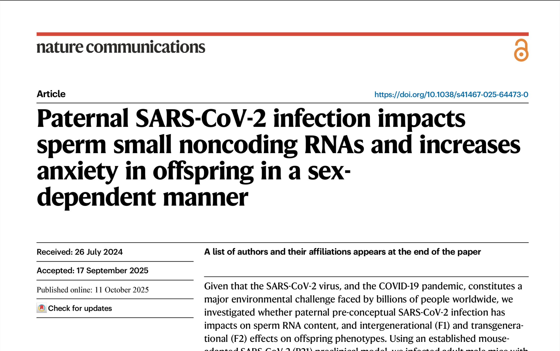 “Paternal SARS-CoV-2 infection alters offspring anxiety-like behaviour and hippocampal gene expression via sperm RNA changes.”