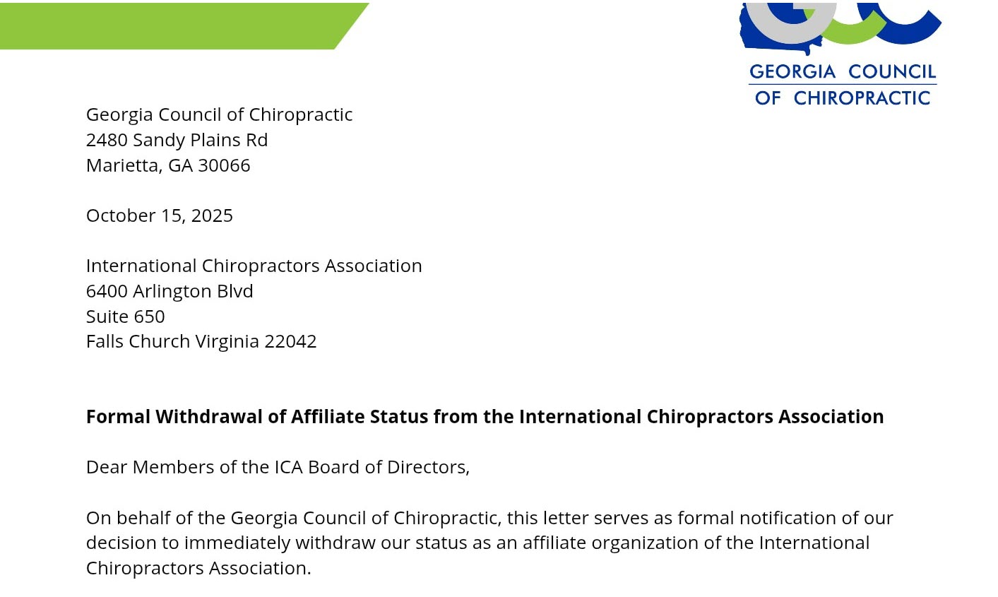Georgia Council of Chiropractic Withdraws from the ICA