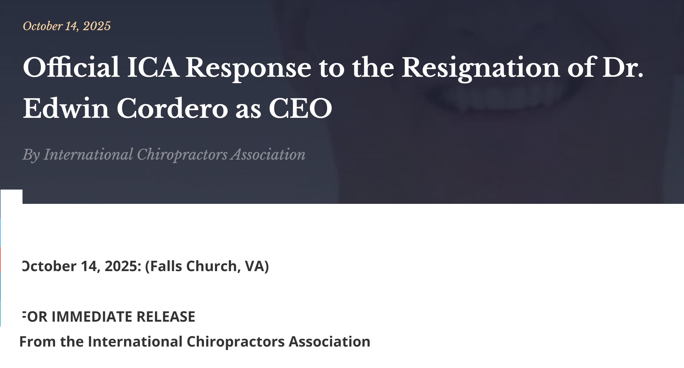 In a video and written statement released on October 14, 2025, International Chiropractors Association (ICA) President Dr. Joe Betz formally acknowledged the resignation of CEO Dr. Edwin Cordero, offering polite thanks while assuring members that “the ICA moves forward stronger than ever.” The message, framed as an appeal to stability, was clearly intended to project confidence after the mass resignations of Cordero, several board members, Representative Assembly members, and the Georgia Council of Chiropractic (GCC).