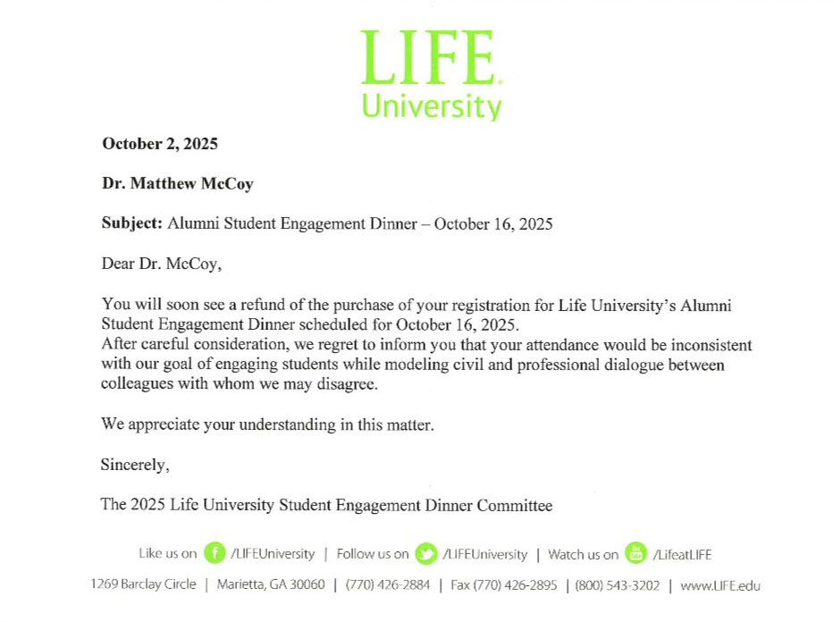 As a LIFE alumnus, I purchased a table to bring students to the dinner. After payment and confirmation, I received a refund notice and a disinvitation on the grounds that my presence was “inconsistent with our goal of engaging students while modeling civil and professional dialogue between colleagues with whom we may disagree.” The statement concedes disagreement, then excludes the dissenter. This is not dialogue, it is censorship dressed up as civility. The lesson to students is unmistakable, controversy will be quarantined from view, not confronted on the merits.
