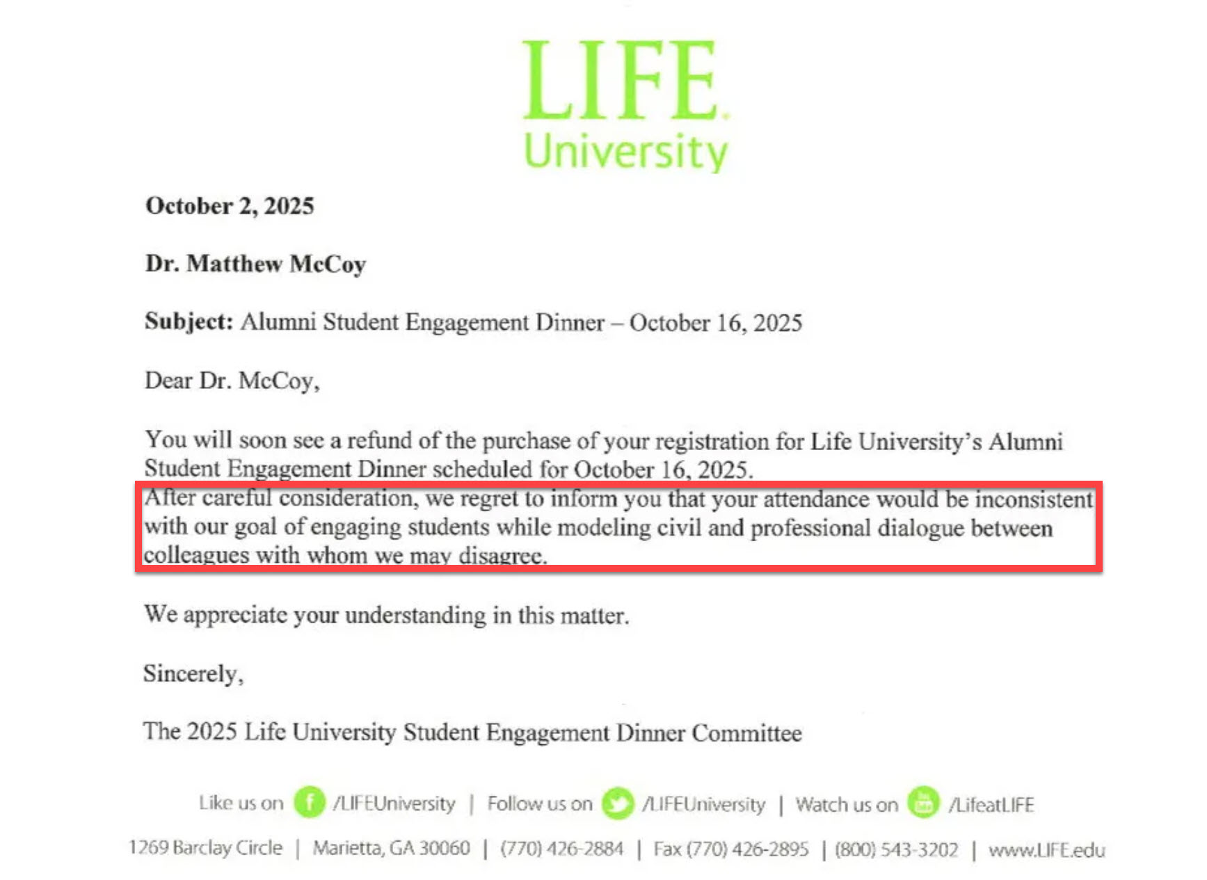 “As a LIFE alumnus, I purchased a table to bring students to the dinner. After payment and confirmation, I received a refund notice and a disinvitation on the grounds that my presence was ‘inconsistent with our goal of engaging students while modeling civil and professional dialogue between colleagues with whom we may disagree.’”