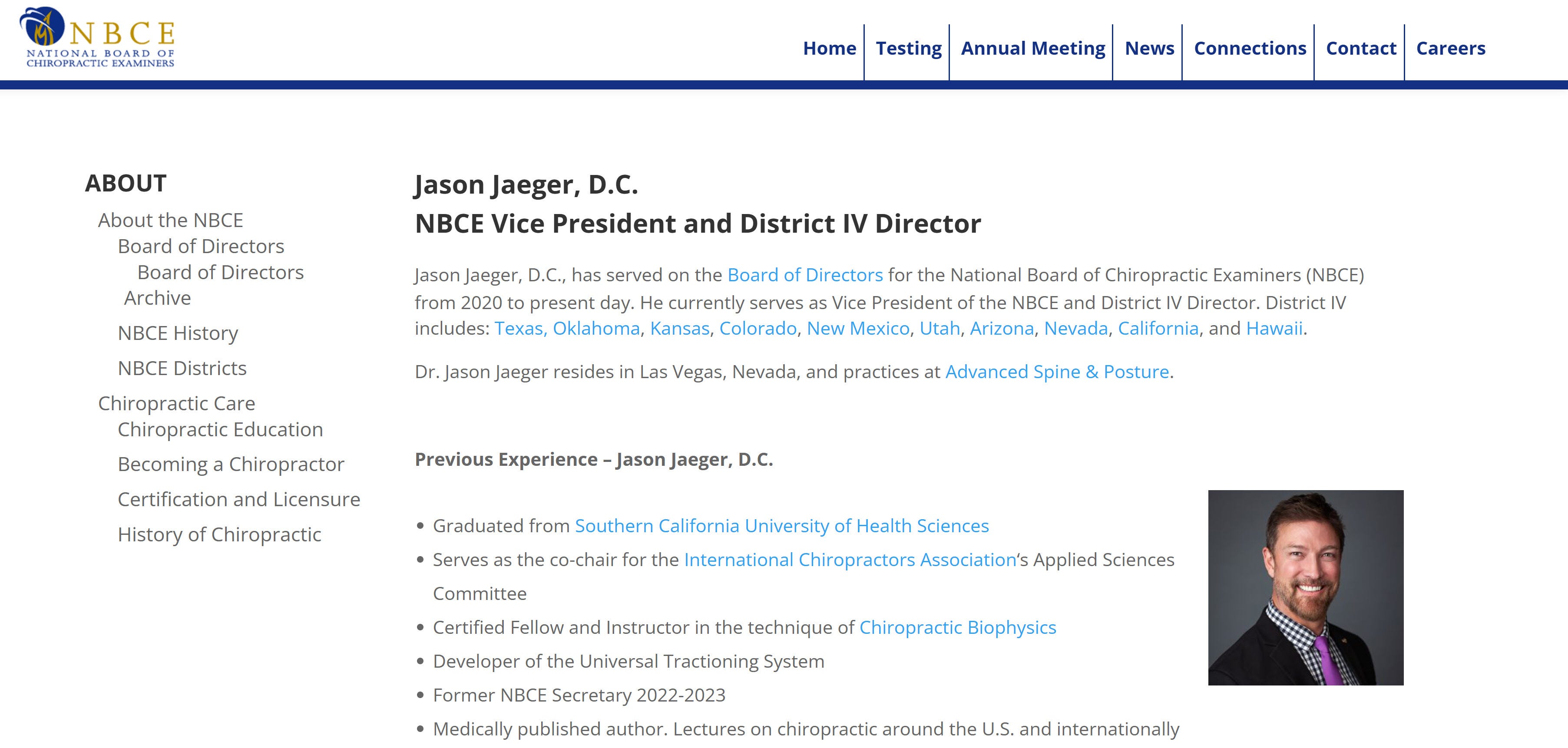 That’s Jason Jaeger, the Secretary and Treasurer of the Chiropractic Physicians Board of Nevada (CPBN), but also a Vice President of the NBCE and a member of the Board of Directors of the International Chiropractors Association. One man, three hats.