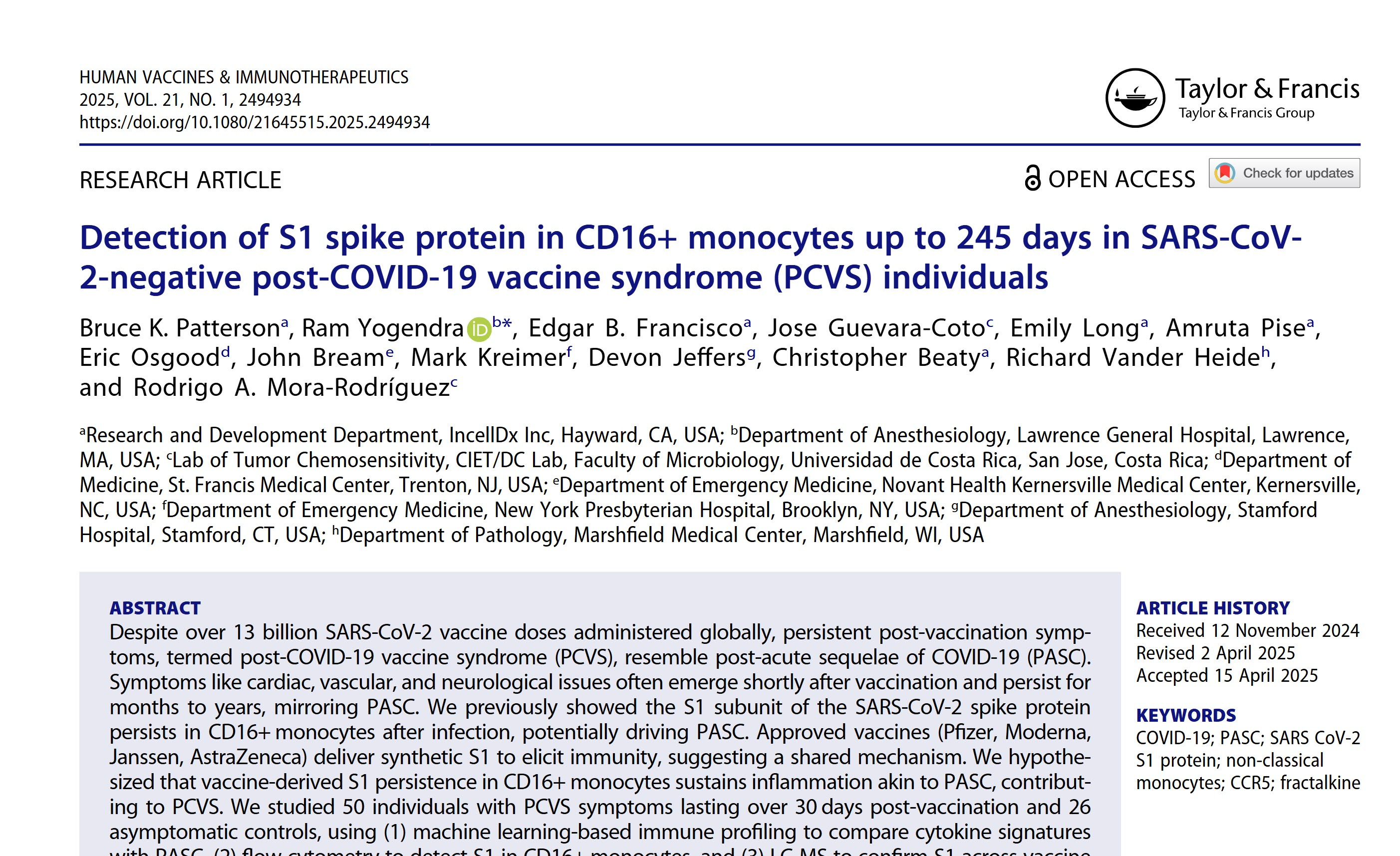 For nearly three years, concerns about lingering spike proteins following COVID-19 vaccination were widely dismissed as unfounded or conspiratorial. Critics were labeled alarmists, anti-science, or worse. However, a recent peer-reviewed study published in Human Vaccines & Immunotherapeutics titled, "Detection of S1 spike protein in CD16+ monocytes up to 245 days in individuals with post-COVID-19 vaccine syndrome (PCVS)", has confirmed these fears as not only plausible but demonstrably accurate.