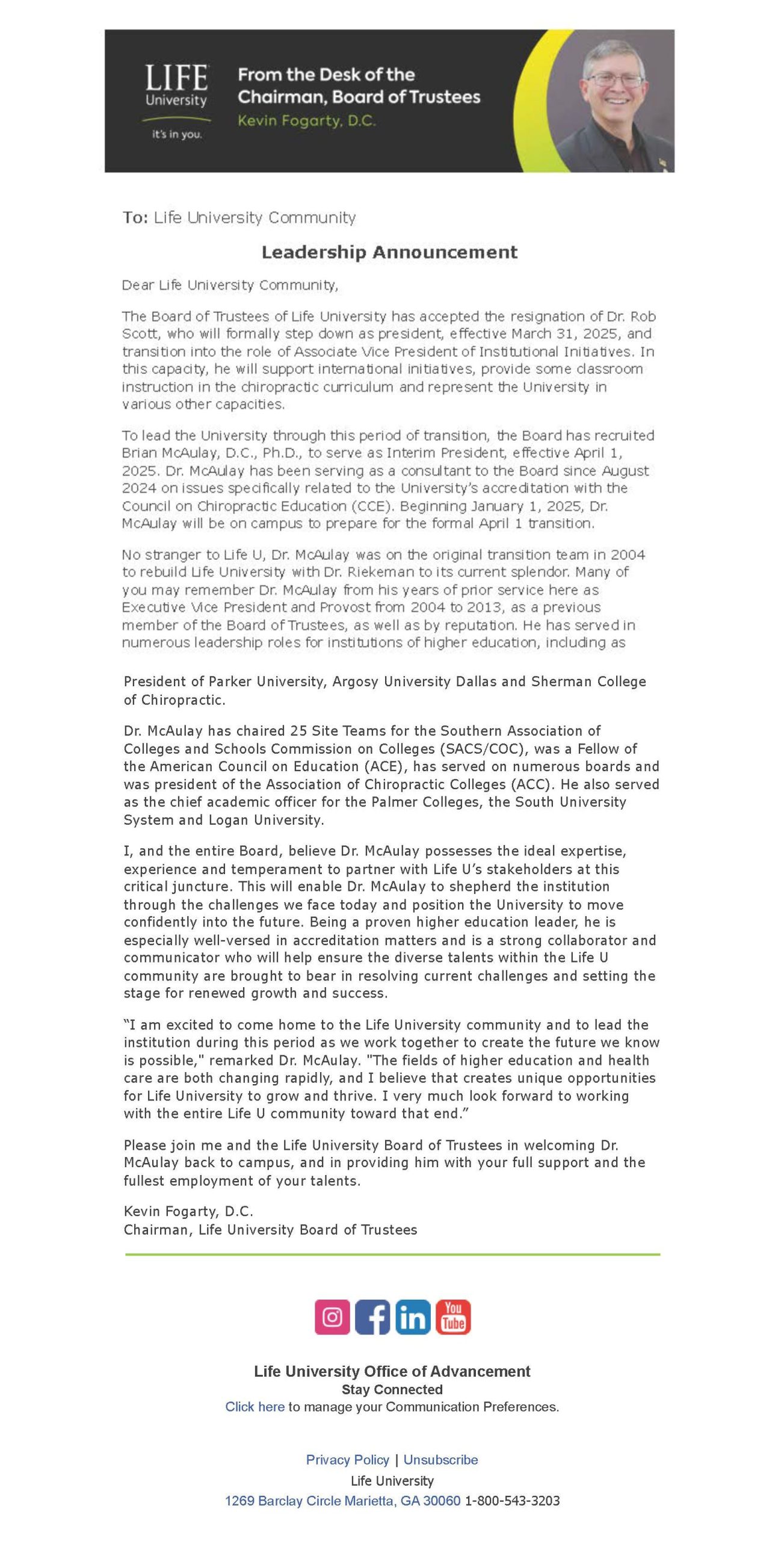 LIFE’s Board of Trustees Chair Kevin Fogarty in a follow up announcement stated that Brian McAulay DC, Ph.D has been recruited to serve as Interim President, effective April 1, 2025. According to Fogarty, McAulay has been serving as a consultant to the Board since August 2024 on issues specifically related to the University’s accreditation problems with the Council on Chiropractic Education (CCE). Fogarty stated that beginning January 1, 2025, Dr. McAulay will be on campus to prepare for the formal April 1 transition.