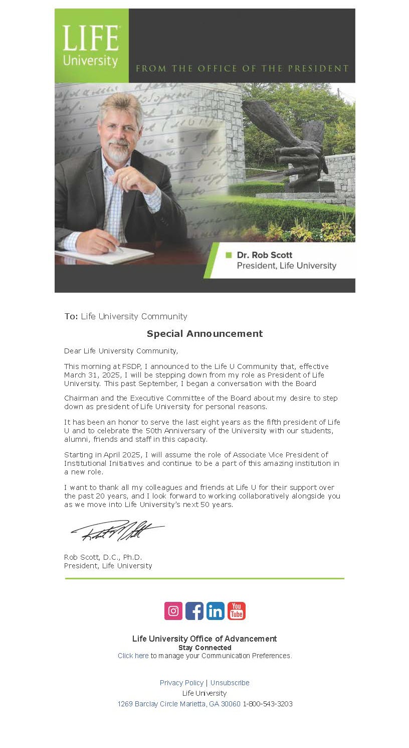 Life University’s President, Rob Scott DC, Ph.D, has announced his resignation, effective March 31, 2025, after serving eight years in the role. While Dr. Scott cites personal reasons for stepping down, his departure comes at a critical time for the institution, which continues to face unresolved accreditation and financial challenges. Adding to the uncertainty is Life University’s mounting debt and ongoing concerns among supporters about the institution’s management and direction.