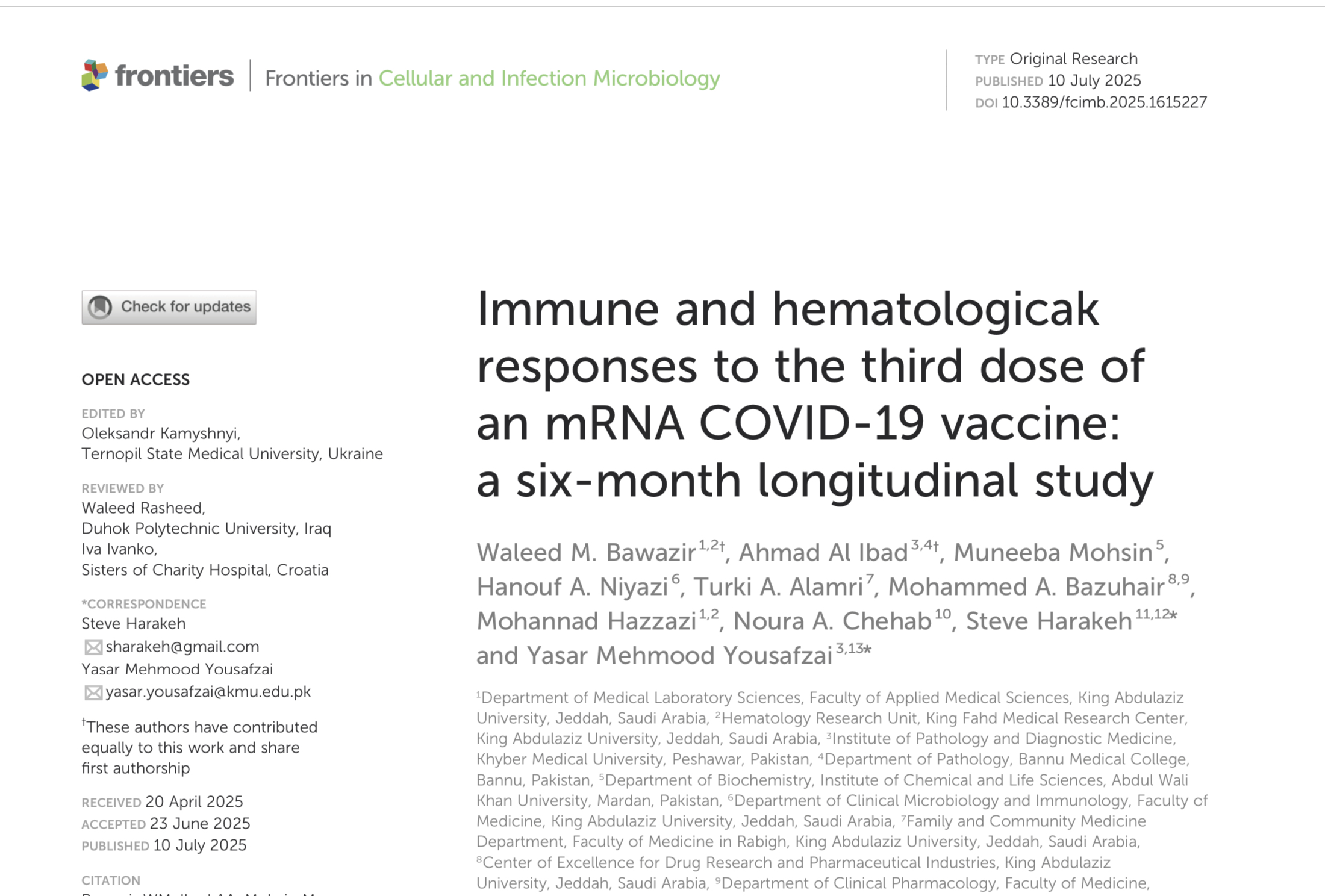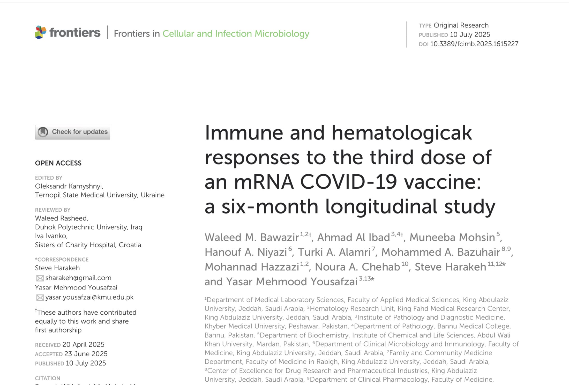 Bawazir WM, et al. (2025). Immune and hematological responses to the third dose of an mRNA COVID-19 vaccine: a six-month longitudinal study. Frontiers in Cellular and Infection Microbiology.