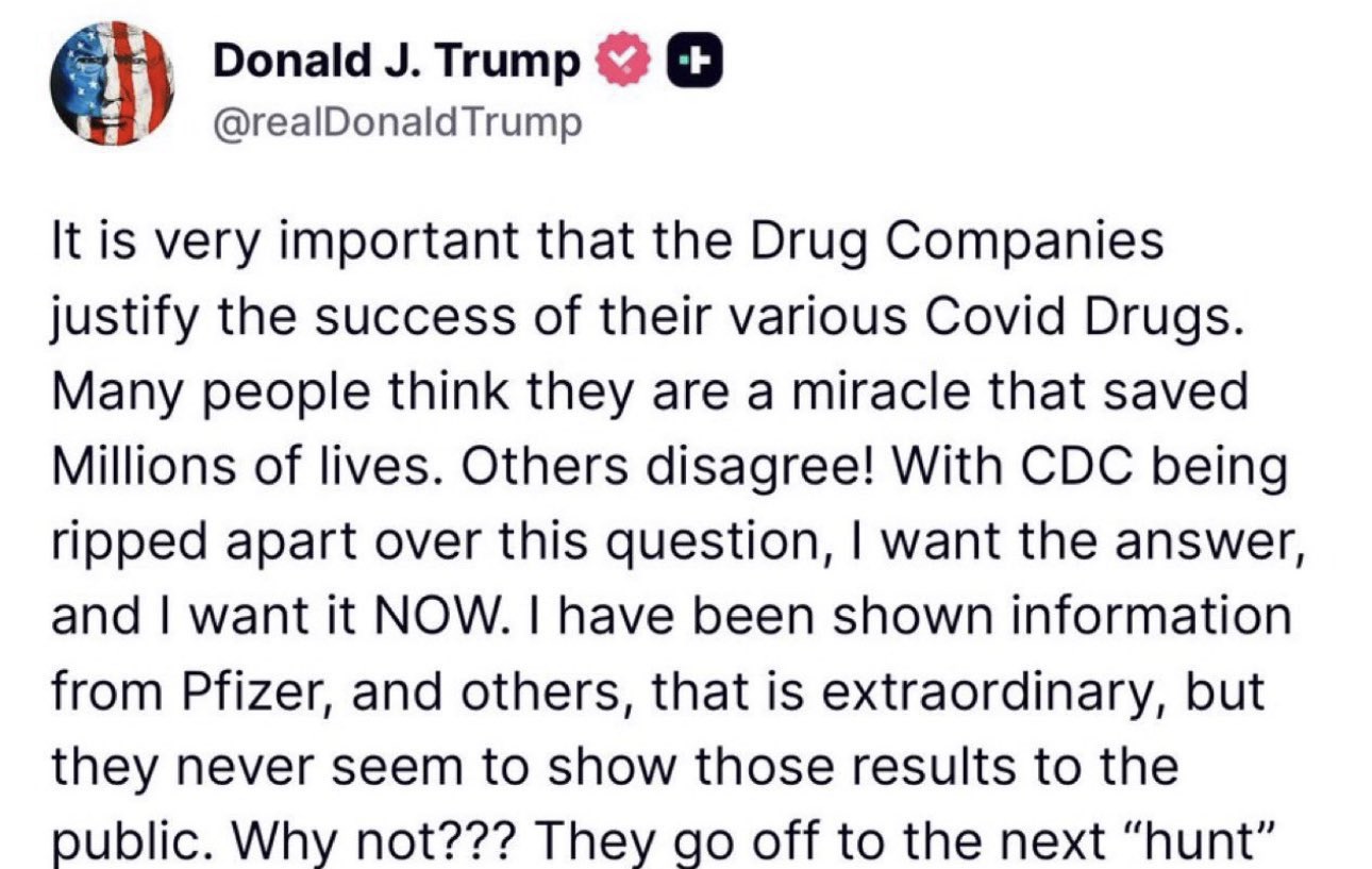 “I want the answer, and I want it NOW. I have been shown information from Pfizer, and others, that is extraordinary, but they never seem to show those results to the public. Why not???”